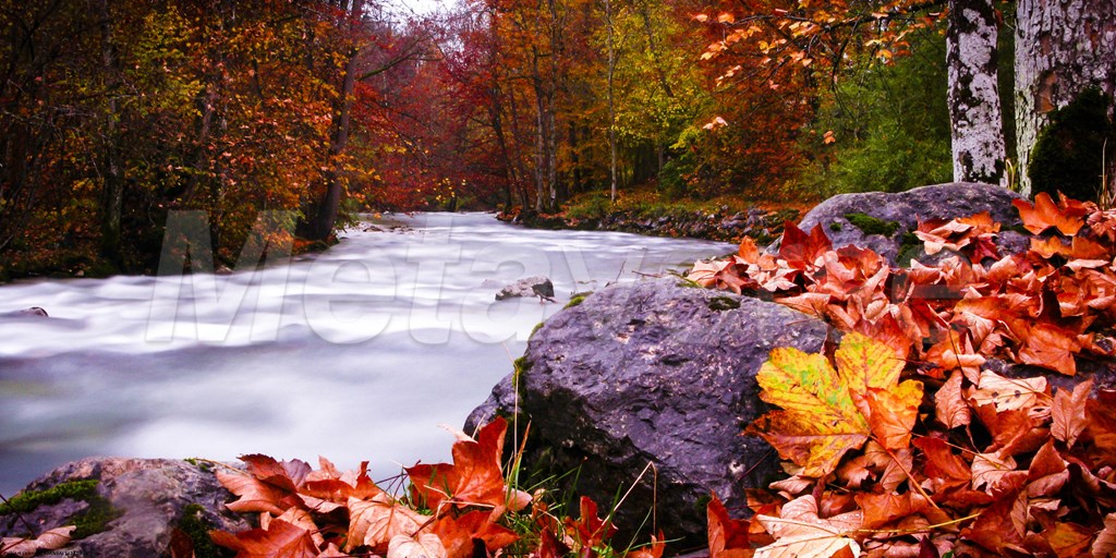 A vibrant photographic image of a gushing stream in a forest of orange and green foliage