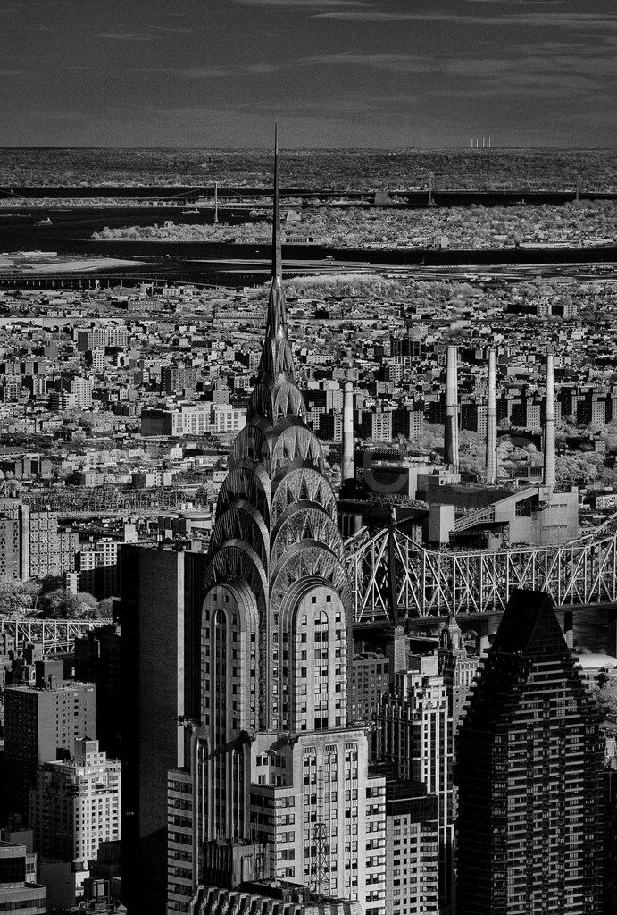 A black and white image of the top of towers with the rest of the city as its background