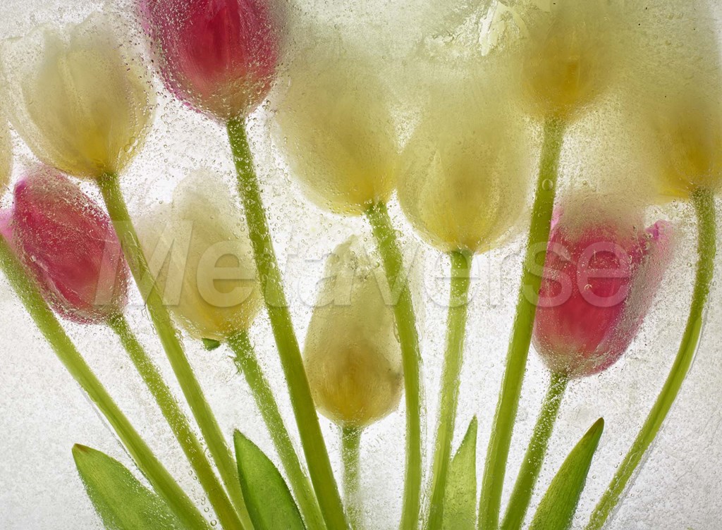 Newly emerged blooms of tulips frozen in a block of ice