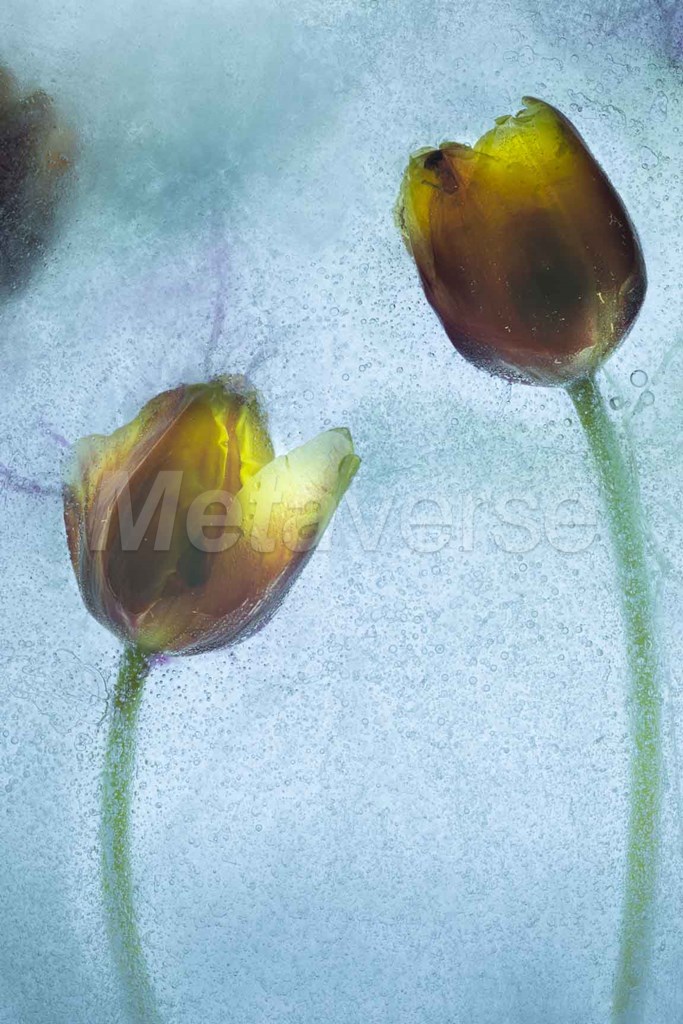 Two yellow blossoming tulips frozen inside a chunk of ice