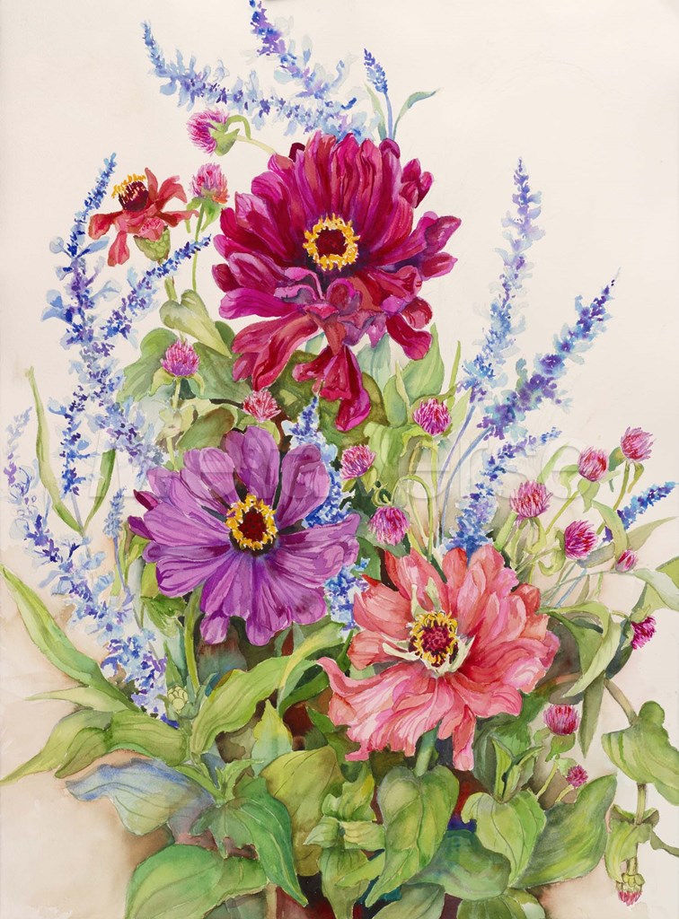 Zinnias and Blue Salvias by Joanne Porter art print