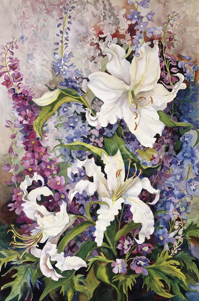 White Oriental Lilies & Pink And Purple Delphinium