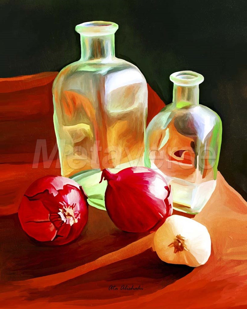 Bottles And Onion by Ata Alishahi art print
